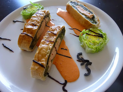 HOJALDRE DE SALMÓN Y ESPINACAS AL ROQUEFORT Y CREMA DE PIQUILLO